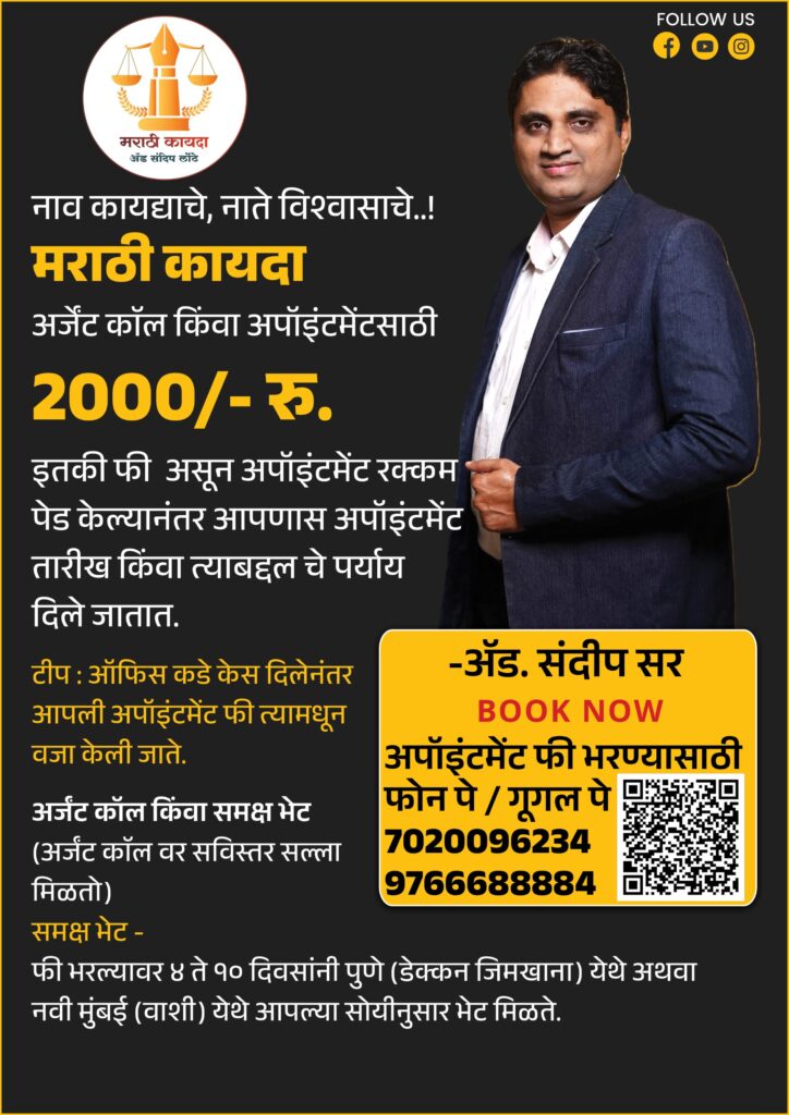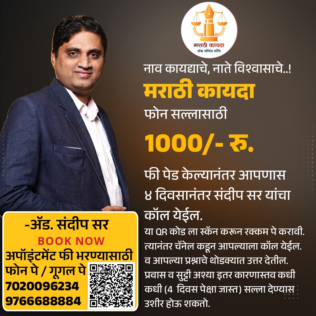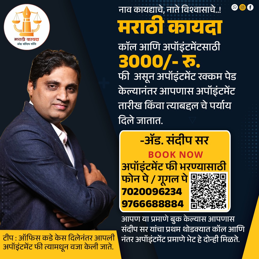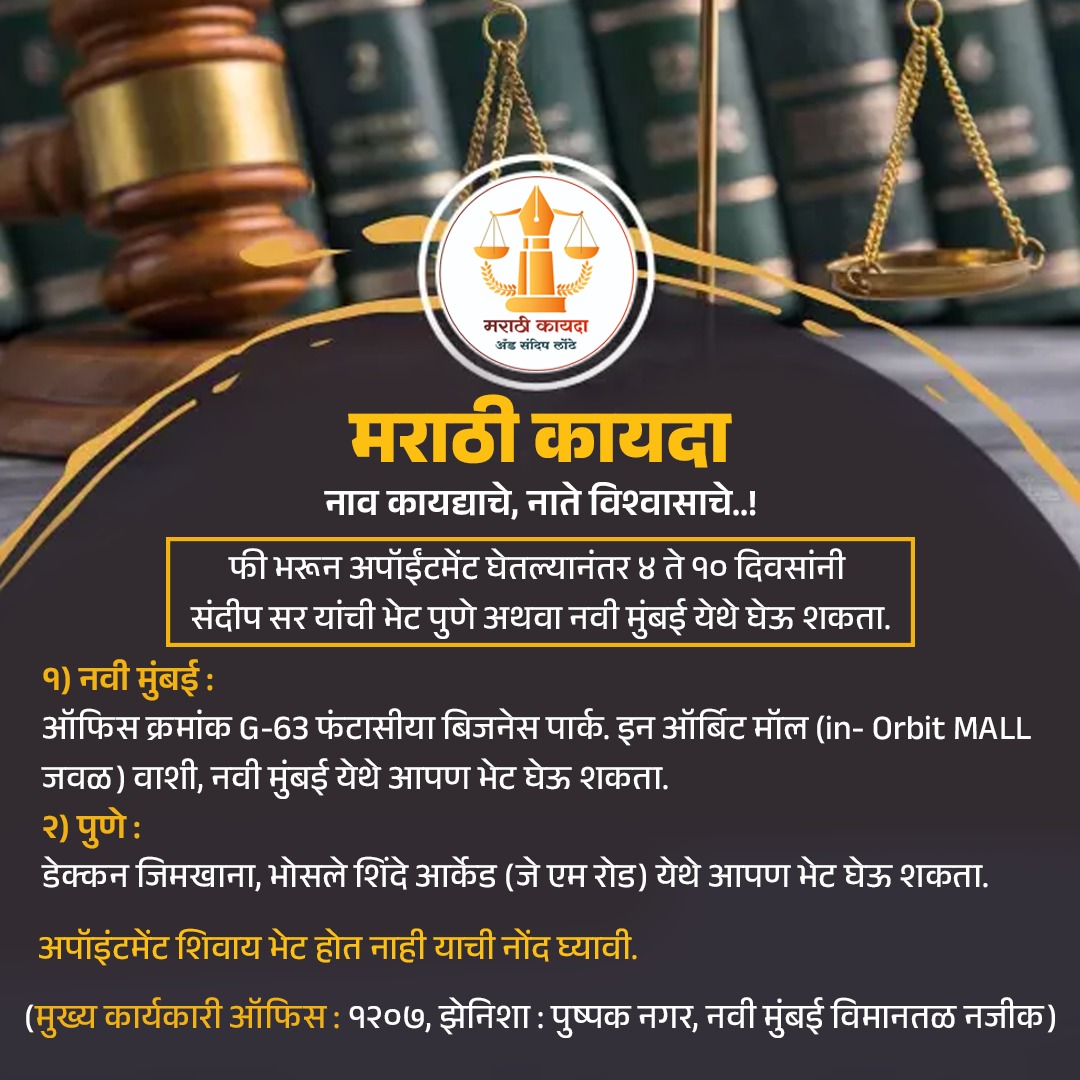 मराठी कायदा तर्फे YouTube वर मोफत कायदेशीर मार्गदर्शन केले जाते,तसेच ऑफिस तर्फे महाराष्ट्र व इतर राज्यात केसेस घेतल्या जातात, तसेच सविस्तर पेड योग्य सल्ला दिला जातो.